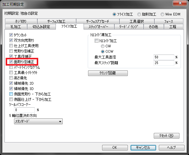 FeatureCAM2014 R3(V20.9.1.27)から、面取り径補正のON/OFFが「初期設定管理」で設定できるようになりました。